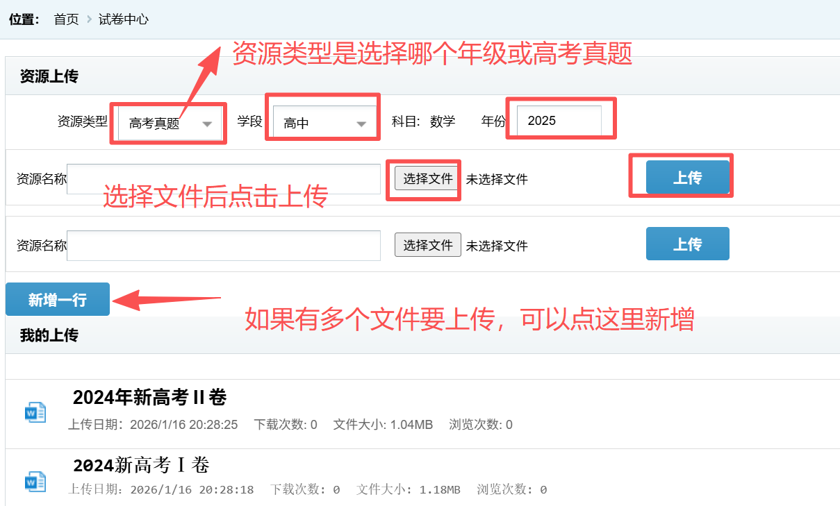 2、选择试卷类型与学段与设置年份后,选择文件进行上传;