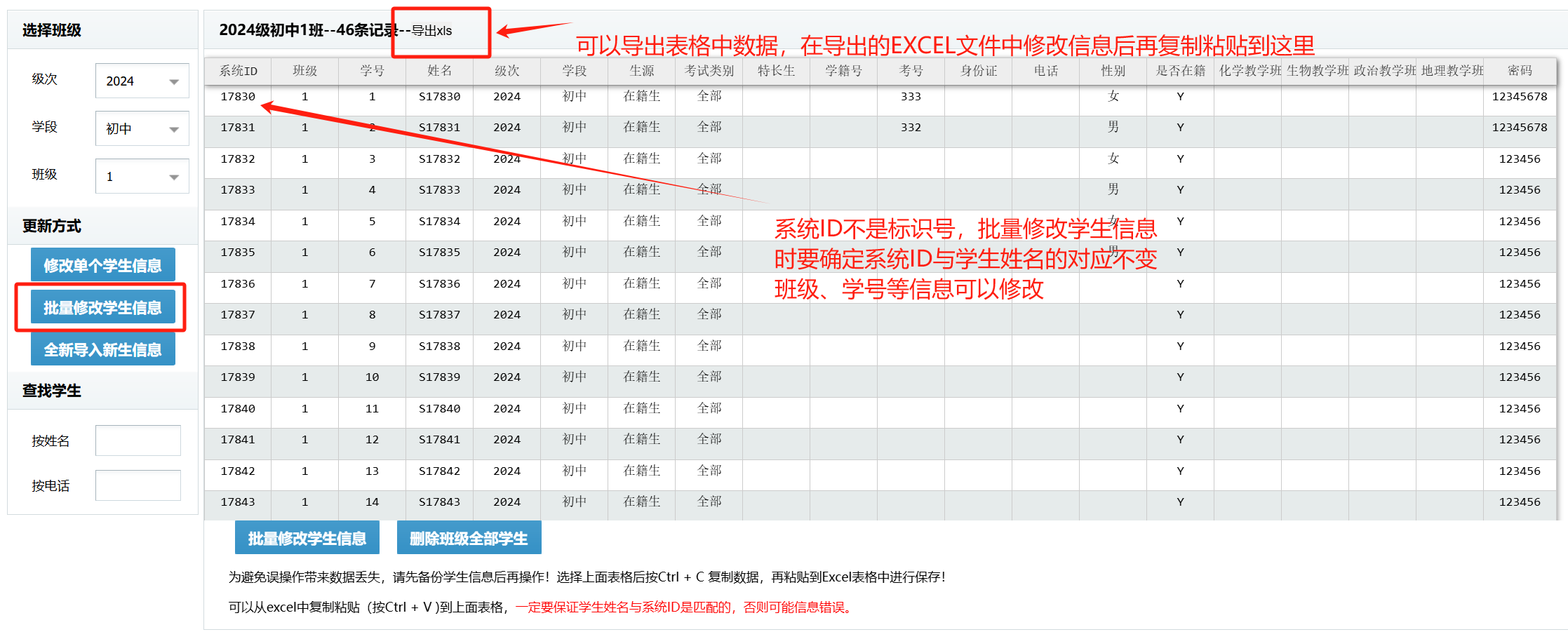 高中年级分科后,可以在这里批量设置修改学生教学班信息。